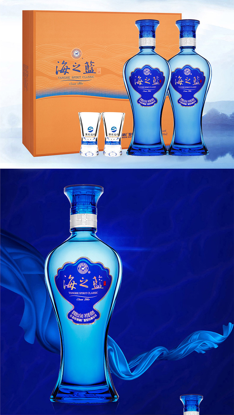 1051.海之蓝 52° 480ml 礼盒装,商城价359.00, 洋河蓝色经典 海之蓝 52度 礼盒装 480ml2瓶高度白酒 口感绵柔浓香型