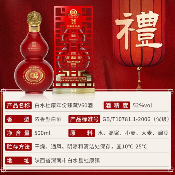 10.杜康 年份臻藏V60,商城价238.00,杜康酒 白水杜康年份臻藏V60红葫芦整箱浓香型白酒52度高度送礼婚宴寿宴酒 白水杜康年份臻藏V60整箱