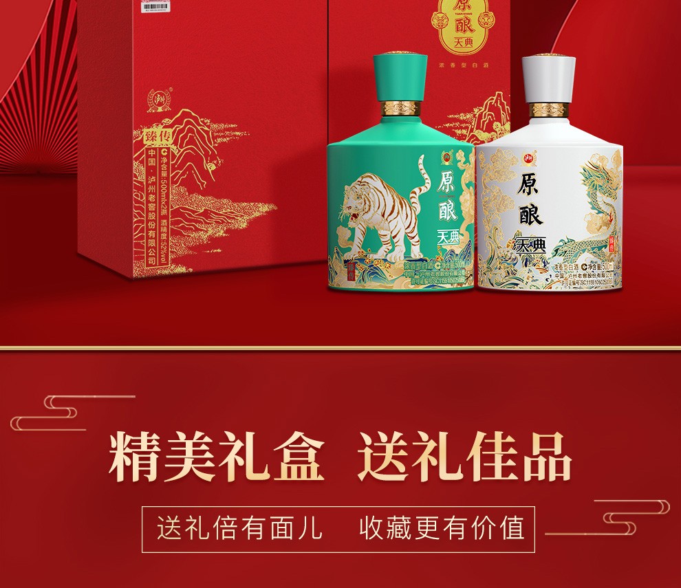 1253.原酿天典臻传礼盒装,商城价212.00,泸州老窖52度 原酿天典臻传 浓香型白酒 纯粮酿造 500ml2礼盒装