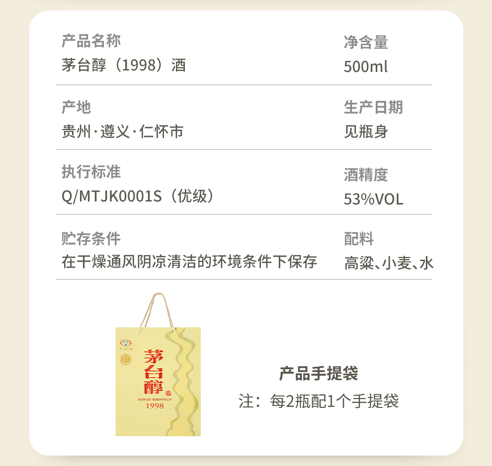 1357.茅台醇1998,商城价968.00,贵州茅台酒厂集团 茅台醇 柔和酱香白酒 53度 500ml6瓶 整箱装 茅台醇 1998