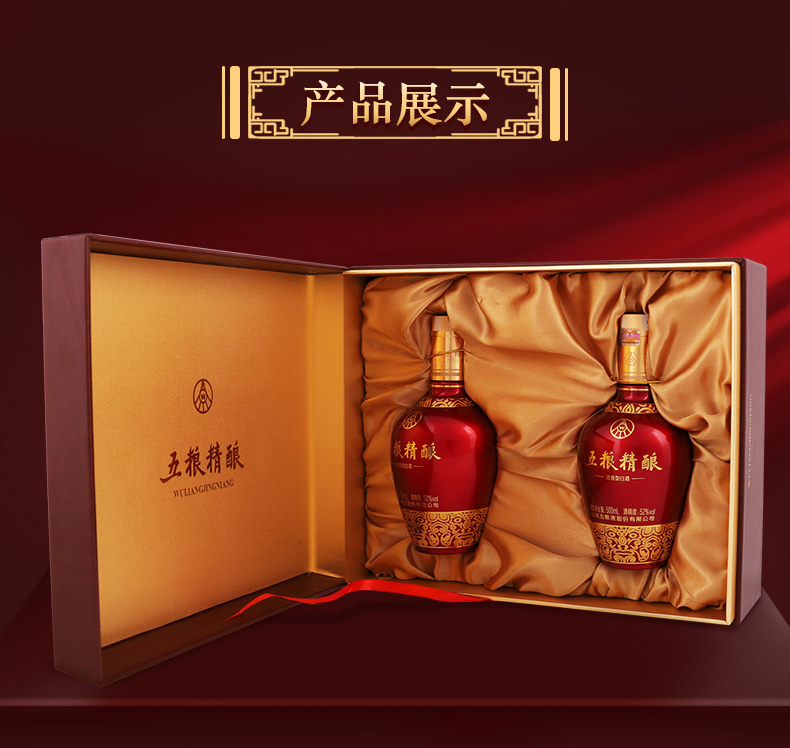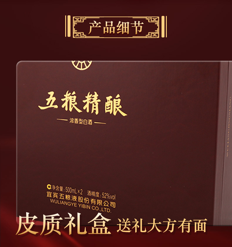 1881.五粮液 精酿(印花中国红皮盒),商城价439.00,MY 五粮液股份公司出品 五粮精酿 浓香型白酒 52度500ml2瓶 礼盒装(印花中国红皮盒装 白酒礼盒)