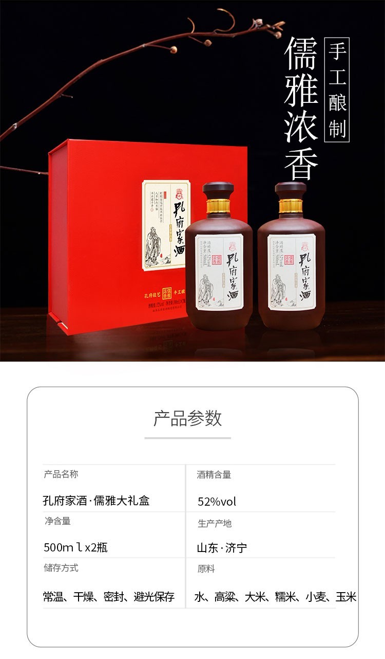 1902.孔府家 儒雅礼盒,商城价199.00,MY 孔府家酒 儒雅手工礼盒 52度 浓香型山东特产名酒白酒 500ml2瓶 礼盒装