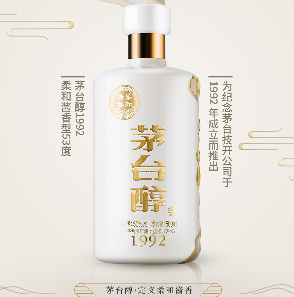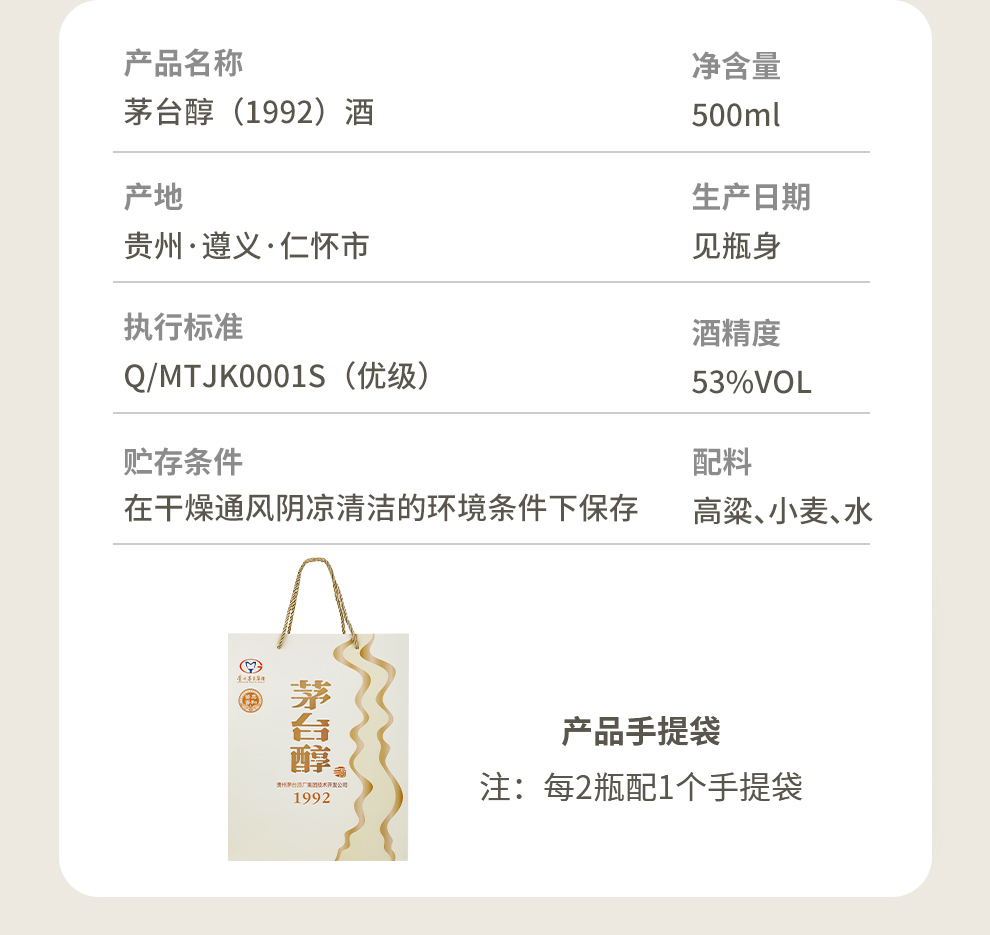 2146.茅台醇1992 整箱装,商城价1388.00,贵州茅台集团 茅台醇1992 柔和酱香型白酒 高度纯粮食酿造酒53度送礼酒礼盒装 500ml6瓶 整箱装