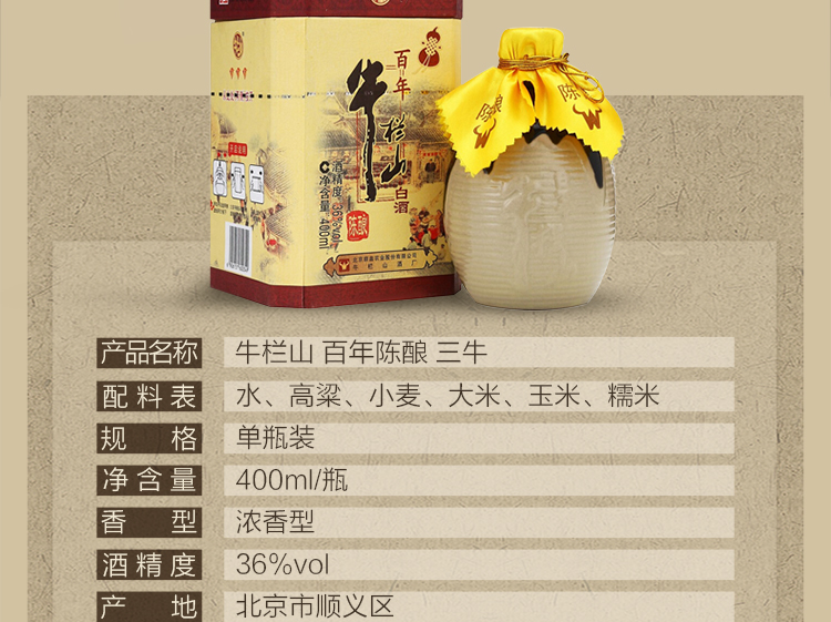 446.牛栏山百年陈酿 36度,商城价125.00,牛栏山 白酒 浓香型 百年陈酿 三牛 36度 400ml 单瓶装