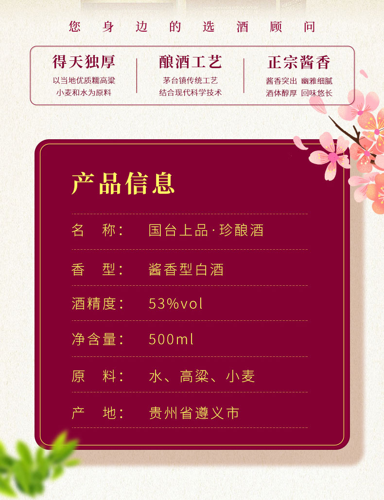 485.国台 上品珍酿品 ,商城价699.00,贵州国台酒 53度国台·上品珍酿酒500ml酱香型白酒单瓶装