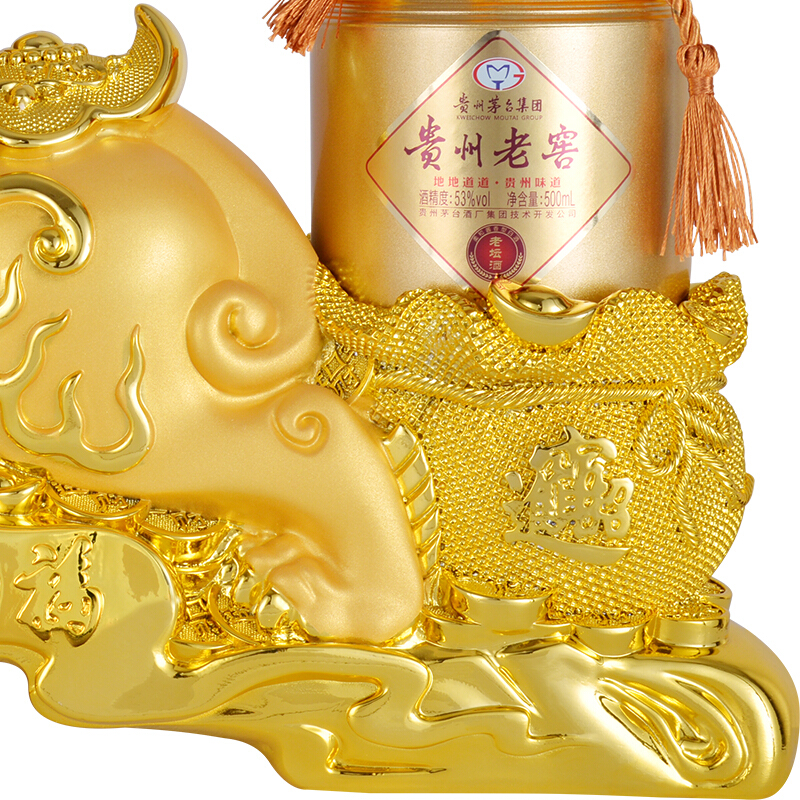 884.招财纳福,商城价534.00,贵州茅台集团53度 贵州老窖 酱香型 白酒 收藏摆柜工艺礼品摆件 招财纳福-金色